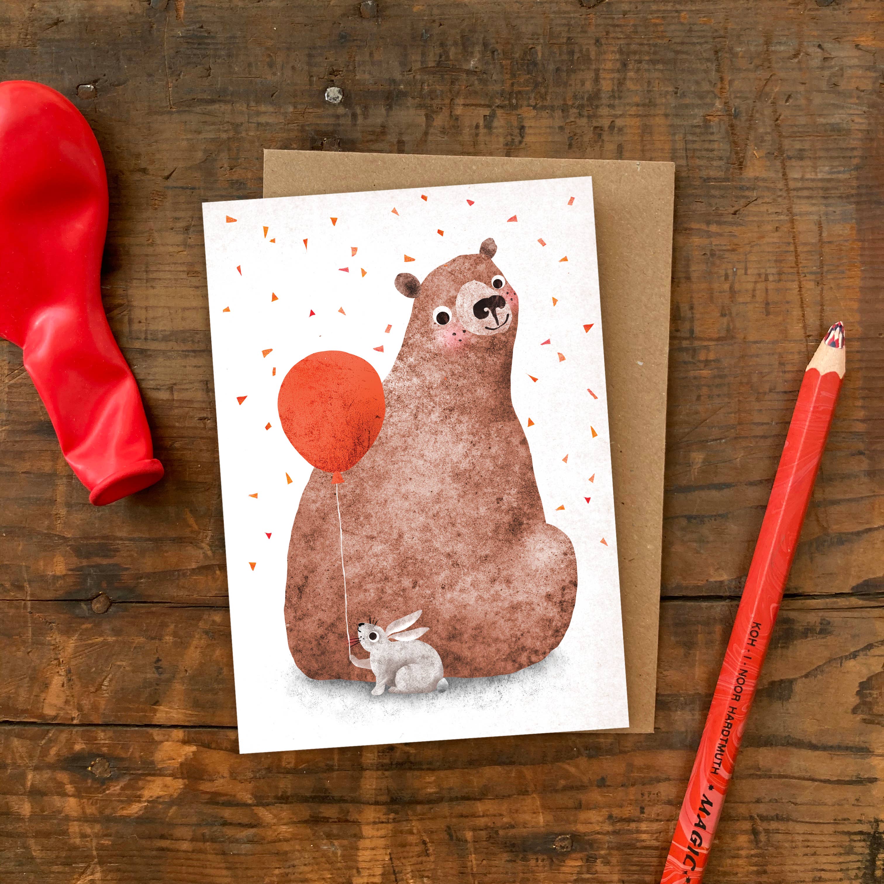 Illustrated greeting card with a fun and friendly bear and bunny design by Emily Nash Illustration.