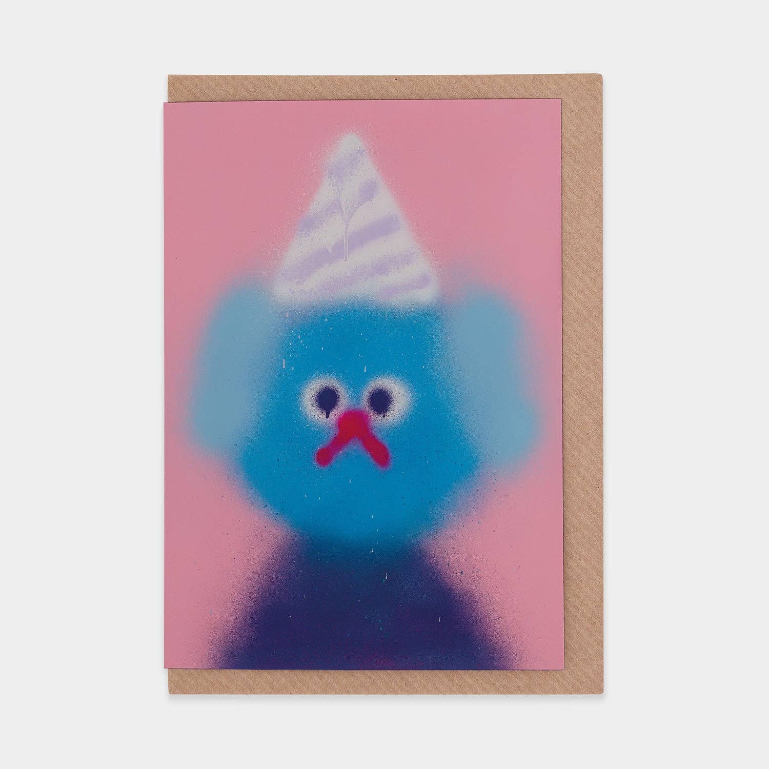 Introducing "Hazelnut Sky," a greetings card by New York-based artist Jon Burgerman, part of the "You Met Me at a Very Strange Time in My Life" series originally exhibited at L21 Gallery, Spain. This series features fun, deadpan characters with party hats and playful colour palettes. Showcasing Burgerman's dry wit and understated humour, each piece was created using spray paint, adding a vibrant and textured aesthetic.